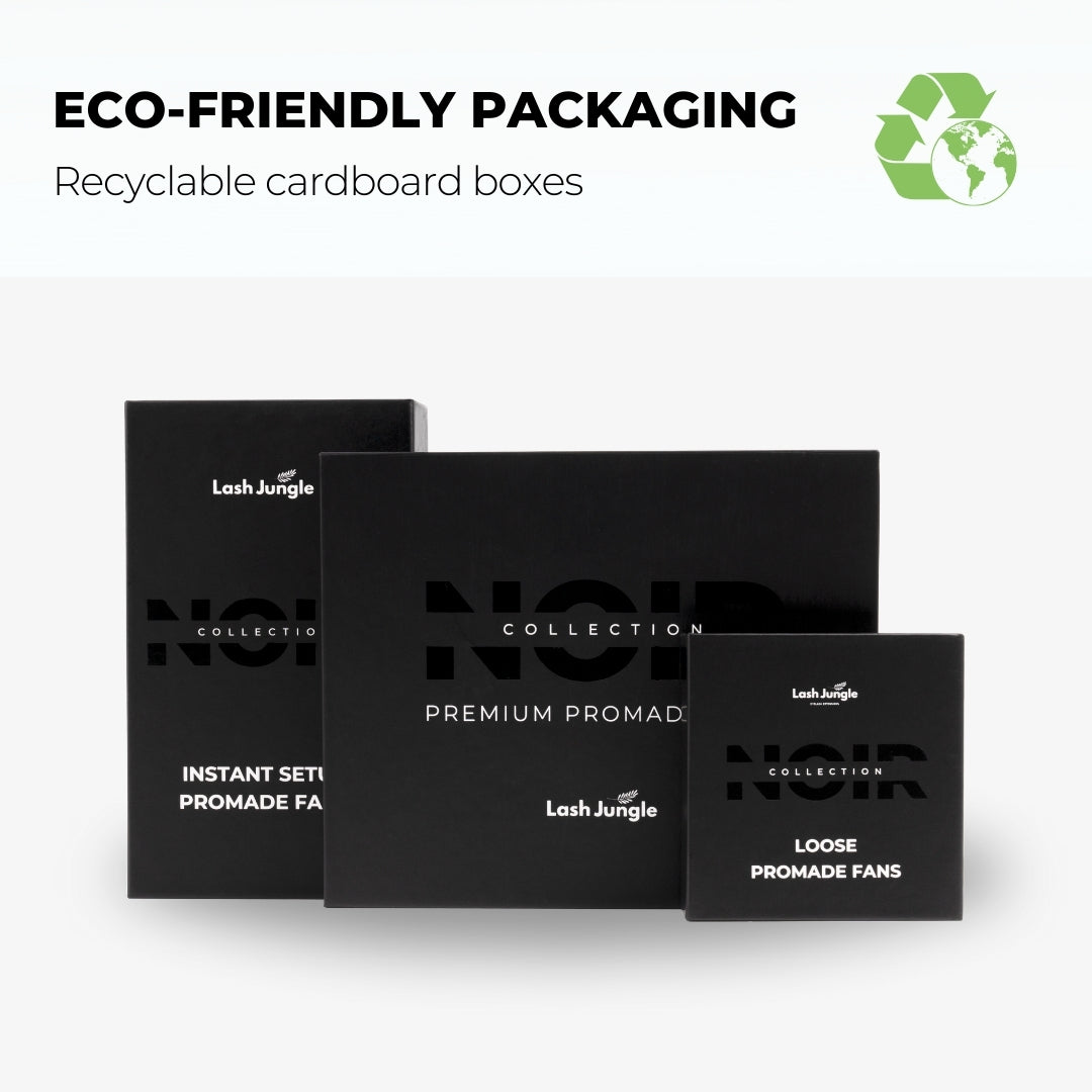 Our revolutionary NOIR collection is the latest addition to our promade range, featuring a narrow width and longer stem that enable you to effortlessly create darker, denser, and fuller volume looks. It is ideal for those who adore the feather-light feeling and luxurious finish of the promade fans but desire the denser and more dramatic look of mega volume sets.
