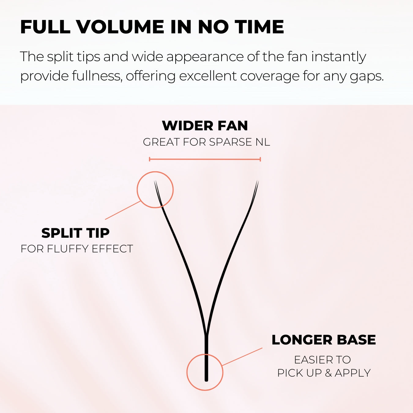 - Full and fluffy volume in no time: These lashes are a game changer for clients with fewer natural lashes. The split tips and wide appearance of the fan instantly provide fullness, offering excellent coverage for any gaps. Opt for the 0.05 thickness for clients with weak or short natural lashes, as it is extremely lightweight.